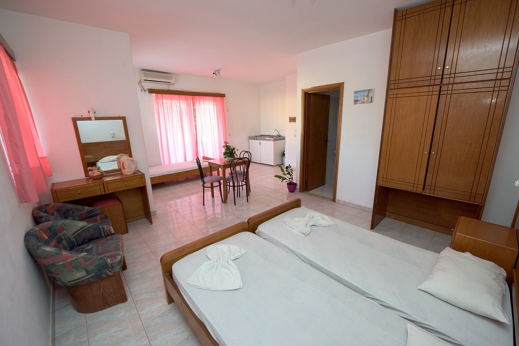 The 2 bedroom apartments feature basic furnishing, with bathrooms and kitchen facilities. They all have balconies or patio, some overlooking the pool with distant views of the sea. The studios accommodate up to 3 persons and all feature balconies, some with sea views.